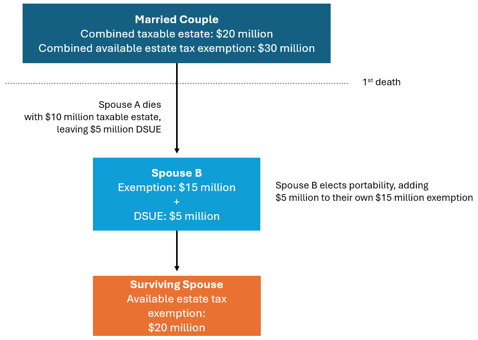 If the surviving spouse makes no taxable gifts, does not remarry, and dies later in 2026, they would be able to shelter $20 million of assets from estate tax ($15 million + $5 million DSUE). At the survivor’s death, they would have a $5 million DSUE in addition to their own estate tax exemption, effectively giving them extra exemption. This combined exemption can significantly reduce or eliminate federal estate tax liability on the second death, allowing more assets to pass to their children.